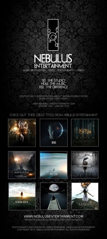 With production credits on dozens of Canada's newest artists, Nebulus Entertainment has set a new standard for graphic design and artist photography as well. Over the course of Jared Robinson's career as an artist/producer, Robinson has been nominated for several Western Canadian Music Awards, an Indie Award for "Best Pop Recording", a Juno Award nomination (with the band Sweetsalt), and Independent Music Award nominations for "Best Music Producer", "Photography" and "Design".