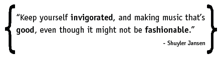 Unquestionably yet altogether courageously, Shuyler is not making music to achieve rock stardom, asserting, “I’m not trying to write hits…I’m not on a giant label, and that’s not what’s being asked of me. What is a hit these days, anyway?!” He reflects, “(Music) phases come in waves…which is why it’s important to retain your originality.” While Shuyler admits that he’s never been a big fan of money, he does stress the importance of longevity, especially for his family’s sake; “Keep yourself invigorated, and making music that’s good, even though it might not be fashionable.”