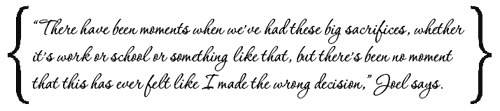 “There have been moments when we’ve made these big sacrifices, whether it’s work or school or something like that, but there’s been no moment that this has ever felt like we made the wrong decision,” Joel says. “There hasn’t ever been a reason to stop.”