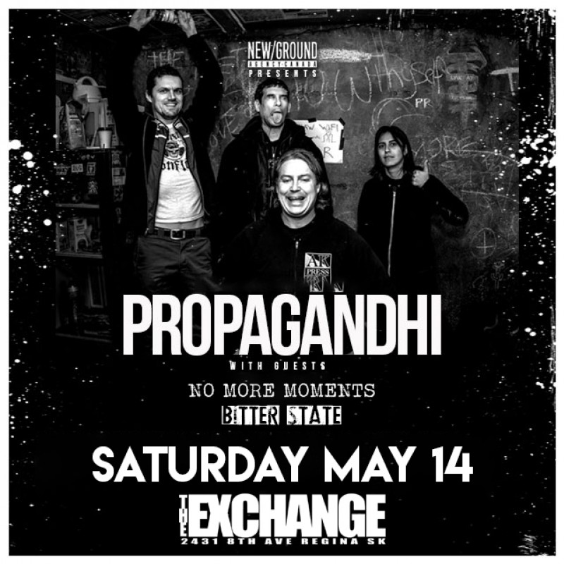 PROPAGANDHI W/ NO MORE MOMENTS & BITTER STATE Who Bitter StateNo More MomentsPropagandhi When May 14, 2022 Where Exchange/The Club 2431 8th Ave, Regina, SK, CA Links theexchangelive.ca/event-calendar/post/prop2021 Back to Events