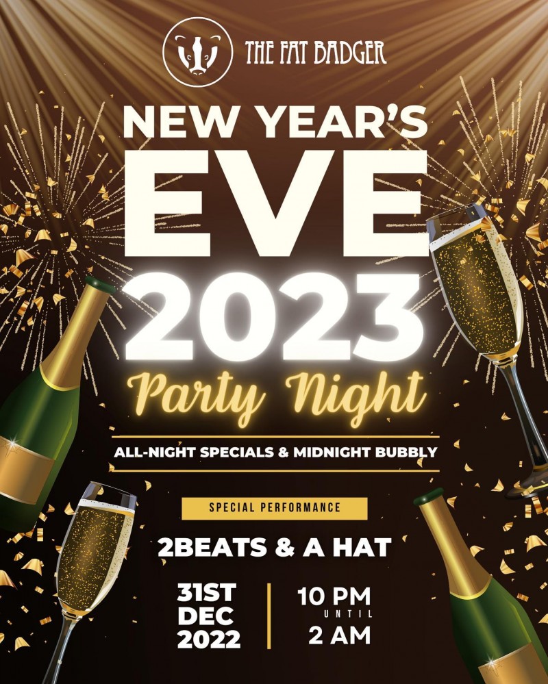 Attention party animals! Are you ready to bring in the new year with a BANG? Come join us at The Fat Badger Saturday for an unforgettable New Year's Eve celebration.We've got DJ duo 2Beats & A Hat on the decks from 10:00 PM till 2:00 AM, ALL-NIGHT drink and shot specials, and a champagne toast at midnight to help you ring in 2023 in style.