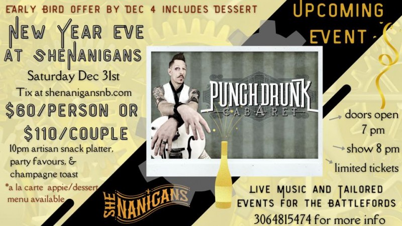 Ring in 2023 with steampunk inspired Punch Drunk Cabaret at SheNanigans in North Battleford. Tickets include a mouth watering platter of artisan snacks served at 10 pm (gf and vegan options). An a la carte appetizer and dessert menu will be available starting 7 pm. The live music starts 8 pm; PDC always puts on a spectacular performance! Tickets are limited and available on our website or call 3064815474 Also check out our “Night Out” packages that include overnight at the Gold Eagle Lodge and courtesy transportation