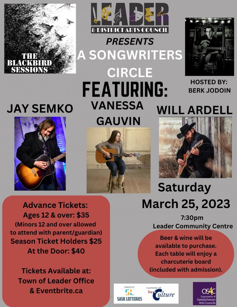 The Leader & District Arts Council are happy to present a songwriters circle featuring Jay Semko, Vanessa Gauvin, and Will Ardell! This event will take place at the Leader Community Centre on March 25th @ 7:30pm. Beer and wine will be available to purchase. Each table will enjoy a charcuterie board, which is included in the price of admission! Children aged 12+ are welcome to join with a parent or guardian.