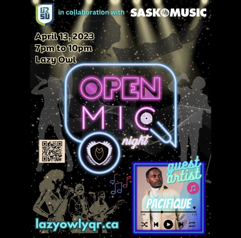 The U of R Student Union is collaborating with SaskMusic for an open mic at the Lazy Owl on the U of R campus! Happening April 13th from 7-10pm, no cover. Featuring guest artist Pacifique! Come listen or perform a song yourself! All styles & genres are welcome and it's a great opportunity to practice your stage skills and connect with other local singers and artists!