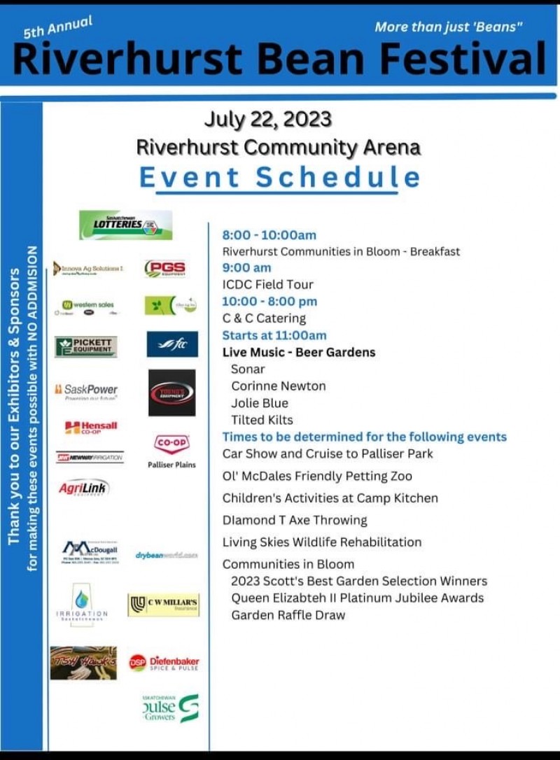 The Riverhurst Bean Festival is returning for its 5th year! This year, featuring live music from Sonar, Corinne Newton, Jolie Blue, and Tilted Kilts. Other attractions include vendor sales, Car show and cruise to Palliser Park, Ol' McDales friendly petting zoo, children's activities at Camp Kitchen, Diamond T axe throwing, and more! For tickets and details, visit the Rivenhurst website.