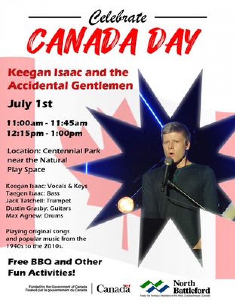 Join Keegan Isaac and the Accidental Gentlemen in celebrating Canada Day on July 1st! Taking place at Centennial Park near the Natural Play Space in North Battleford, SK from 11am-1pm. Featuring a FREE BBQ and other fun activities!