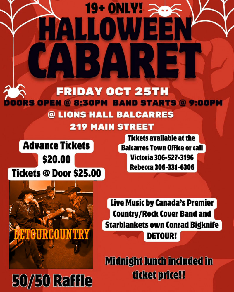 Halloween Cabaret Who DETOUR When October 25, 2024 - Doors at: 8:30pm / Showtime: 9:00pm Where Lion's Hall 219 Main St, Balcarres, SK Links www.instagram.com/p/DA3hcD6R2jo/ Back to Events