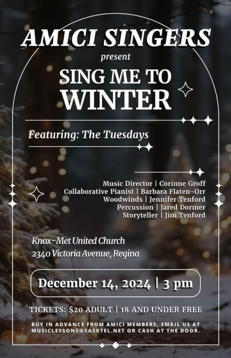 Amici Singers present Sing Me To Winter When December 14, 2024 - Showtime: 3:00pm Where Knox-Met United Church 2340 Vitoria Avenue, Regina, SK Links www.facebook.com/photo/?fbid=570348578719644&set=a.192970186457487 Back to Events