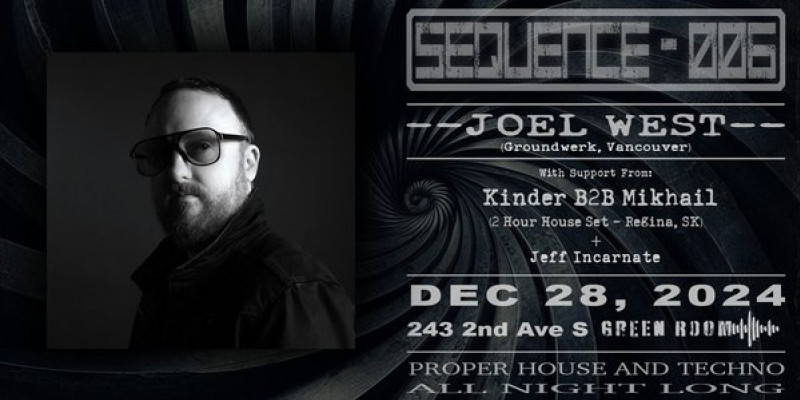 Sequence Night Clubs YXE Presents: Sequence - 006: Joel West (Groundwerk, Vancouver) Join us for a night of solid techno and house music with one of Canada's premier techno DJs! Joel West has been on opening support for international touring talent like Mark Broom, Coyu, Spartaque, Layton Giordani, Julia Govor, MSTRKRFT, MAEDON, D-Unity, Dave Angel, Gene Farris, Ardalan, Kevin & Dantiez Saunderson, DJ Heather, and others in venues such as Vantek, Open Studios, MIA, Gorgomish, The Beaumont Studios, The Hifi Club, and more. Joel has played multiple times at Shambhala, Electric Love Festival, Festivus, and FozzyFest. In 2018, Joel played Melkweg in Amsterdam during ADE. Joel has released music on Kneaded Pains, Unity, Coincidence, Space Kraft, No Match, Superfreq, Groundwerk, Kiko, Play, Air Texture, RF, East Van Digital, Nuevadark, Cuete, and Woodwork. Joel is a co-founder of Groundwerk and the label head at Groundwerk Recordings. Joel produces techno and frequently plays his own music in his DJ sets.