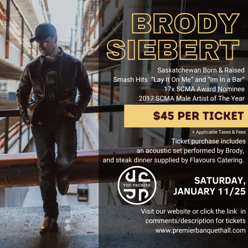 Repeated SCMA nominee and winner, Brody Siebert will be helping us ring in 2025 with this incredible acoustic show! Tickets also includes a steak dinner provided by our friends at Flavours Catering.