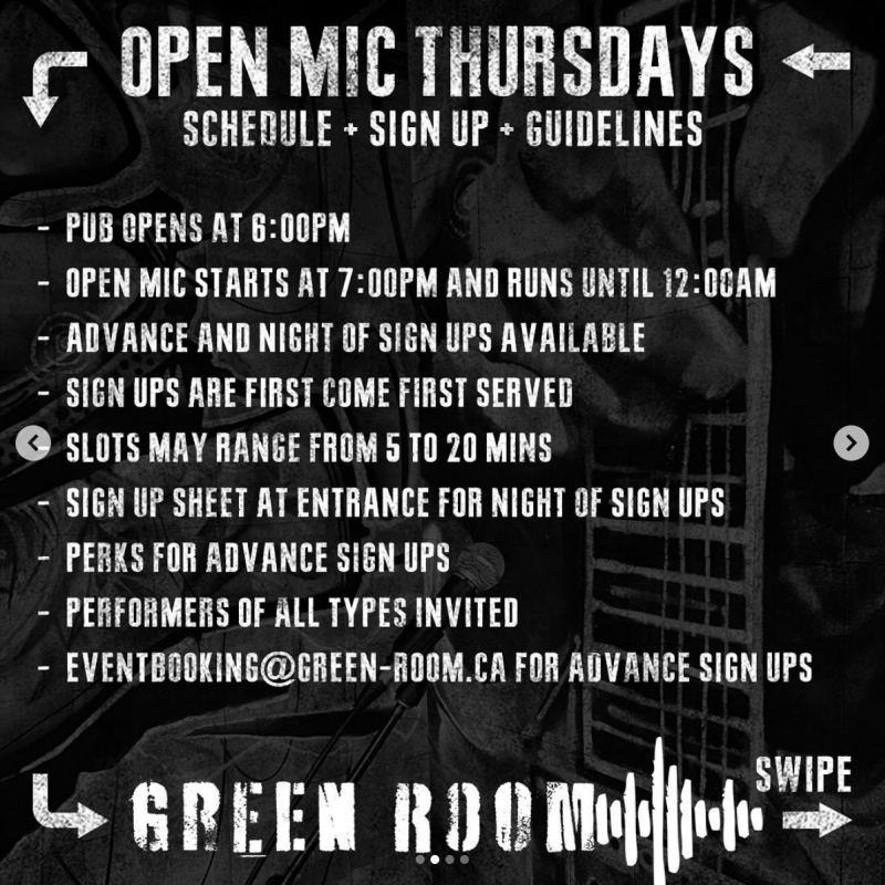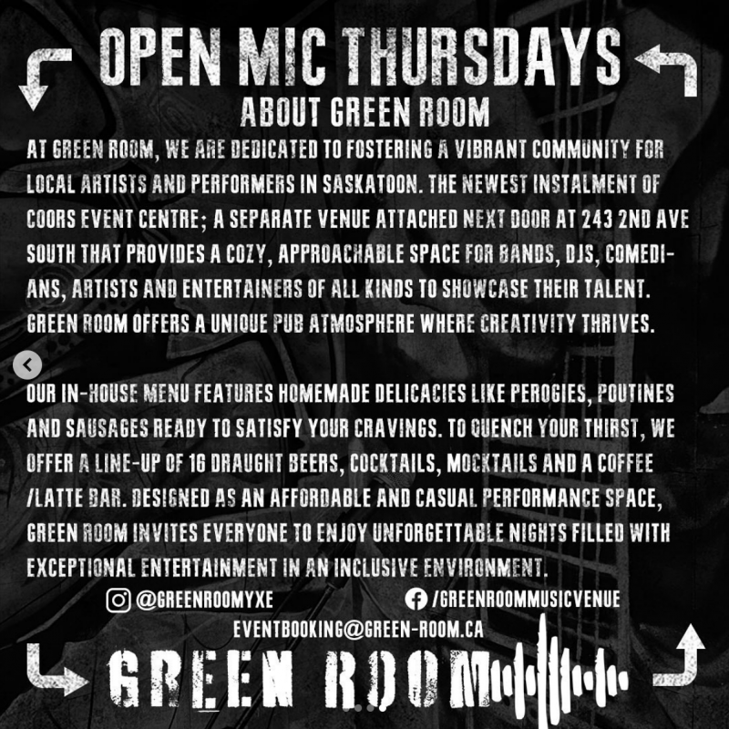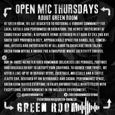 ANNOUNCEMENT Welcome to performers of all kinds; Open Mic Thursdays at Green Room is Saskatoon’s only family friendly open mic night! Whether you’re a comedian, poet, musician, band, lyricist, performance artist, clown, magician, new, or established, get in the spotlight, on the sound and cease the opportunity to show Saskatoon your stuff!