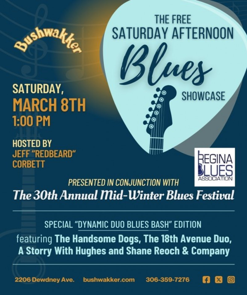 THE ANNUAL FREE SATURDAY AFTERNOON BLUES SHOWCASE. Presented in conjunction with the 30th Mid-Winter Blues Festival. Enjoy this special “DYNAMIC DUO BLUES BASH” event which will showcase four local blues acts including; The Handsome Dogs, The 18th Avenue Duo, A Storry With Hughes and Shane Reoch & Company. Hosted by Jeff “Redbeard” Corbett. Be sure to enjoy a slice of his annual Bushwakker Blues event dessert, Redbeard’s Chocolate Caramel Cinnamon Bun Cheesecake! 1:00 PM – 4:45 PM!