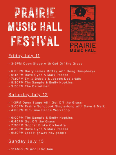There's going to be lots of music and lot of fun to be had at the Prairie Music Hall Festival on July 11 to 13 at Dexter Hall near Turtle Lake, SK. Come for the day or come for the weekend.