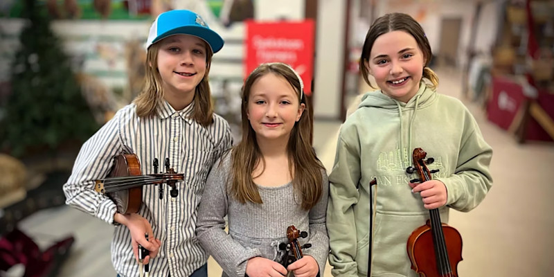 Fiddlers Cassian Owen, 11, Margot Lavergne-Ryalls, 11, and Avery Johnston, 9, formed the Busking Savants Trio in 2024. All three of these talented musicians study with Kim de Laforest and share their teacher's passion for music and love of entertaining.