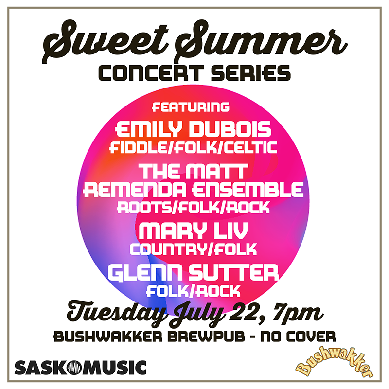 SaskMusic continues our Sweet Summer concert series with a FREE show at Bushwakker. Join us for 4 great artists and great food and drink! This is a licensed venue (no minors).