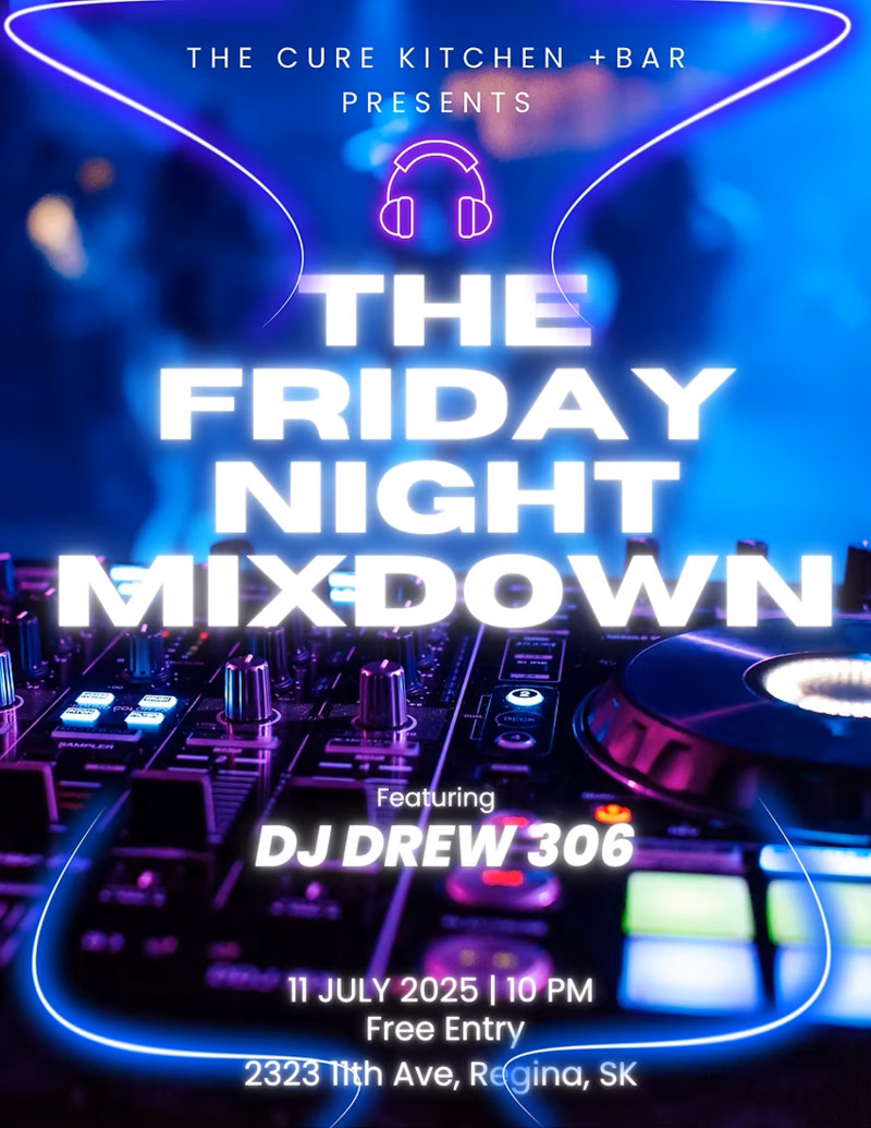 DJ Drew 306 When July 11, 2025 - Showtime: 10:00pm Where Cure (The) 2323 11th ave , Regina, SK, CA Links www.thecureregina.com/event-details/dj-drew-306 Smooth beats all night with DJ Drew 306 Music: 10PM No cover 19+ event Back to Events