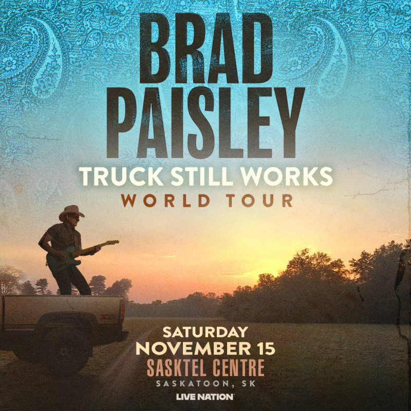 Brad Paisley: Truck Still Works World Tour When November 15, 2025 - Showtime: 7:30pm Where Sasktel Centre 101-3515 Thatcher Ave, Saskatoon, SK, CA Links www.ticketmaster.ca/brad-paisley-truck-still-works-world-saskatoon-saskatchewan-11-15-2025/event/110062CD7BDC2415?mc_cid=7af5b69616&mc_eid=6115673ac6 Back to Events