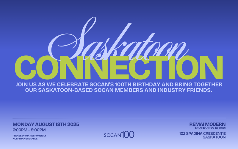 Join SOCAN representatives on August 18 as they bring together the Saskatoon-based SOCAN members and industry friends at the SOCAN Saskatoon Connection Party in celebration of SOCAN's 100th anniversary.
