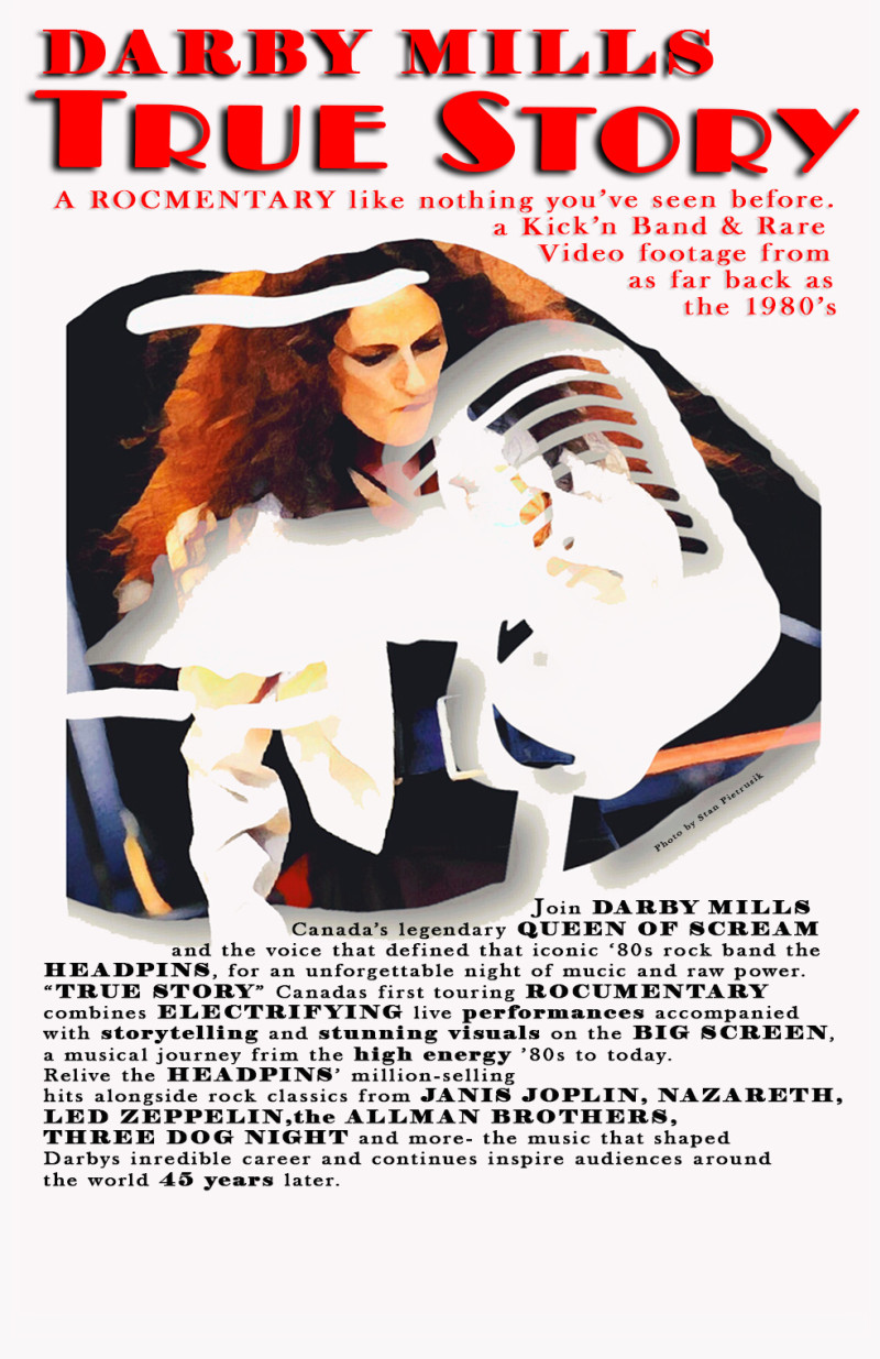 Canada’s 1st touring ROCKUMENTARY, combines ELECTRIFYING Live Performances accompanied with Storytelling & Stunning Visuals on the BIG SCREEN. Join Canada’s Legendary QUEEN OF SCREAM, DARBY MILLS, the Voice that defined that Iconic 80's rock band the HEADPINS for the HEADPINS’ million-selling Hits alongside Rock Classics from JANIS JOPLIN, NAZARETH, LED ZEPPELIN, ALLMAN BROTHERS, THREE DOG NIGHT and more --- the Music that shaped Darby’s Incredible Career and continues to inspire Audiences around the World 45 Years later!