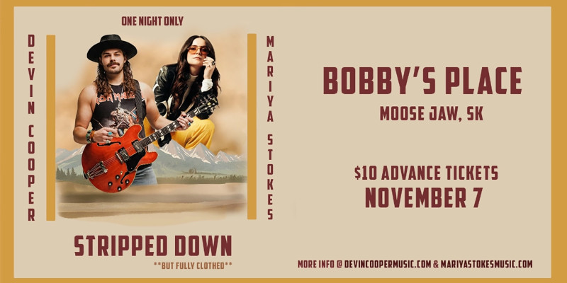 Join award-winning country artists Devin Cooper and Mariya Stokes for a fun, intimate acoustic evening of live music on November 2nd at Bobby's Place in Moose Jaw, SK on their Stripped Down *But Fully Clothed* Western Canadian tour.