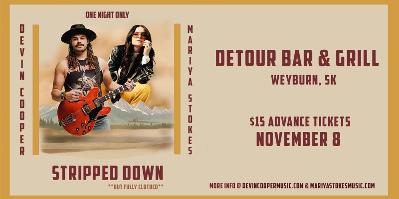 Join award-winning country artists Devin Cooper and Mariya Stokes for a fun, intimate acoustic evening of live music on November 8th at Detour Bar & Grill in Weyburn, SK on their Stripped Down *But Fully Clothed* Western Canadian tour.