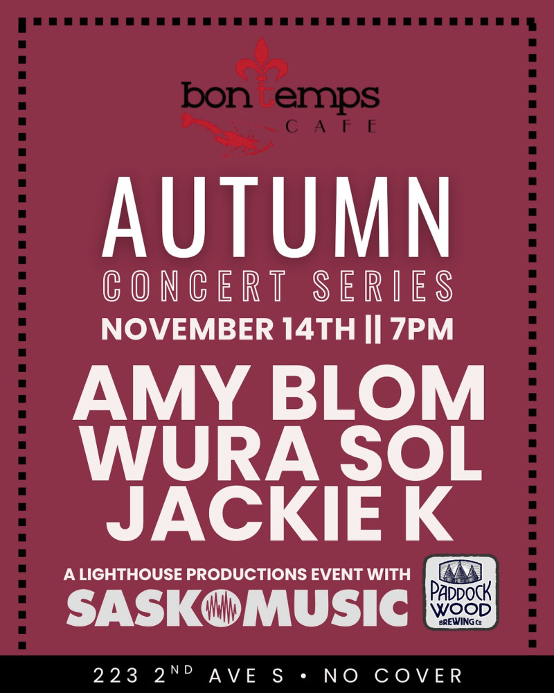 Our next date of the Autumn Concert Series at Bon Temps, in partnership with Lighthouse Productions and Paddockwood Brewing is November 14th! This is the first of a two part fall series at Bon Temps Cafe featuring three performers each night.