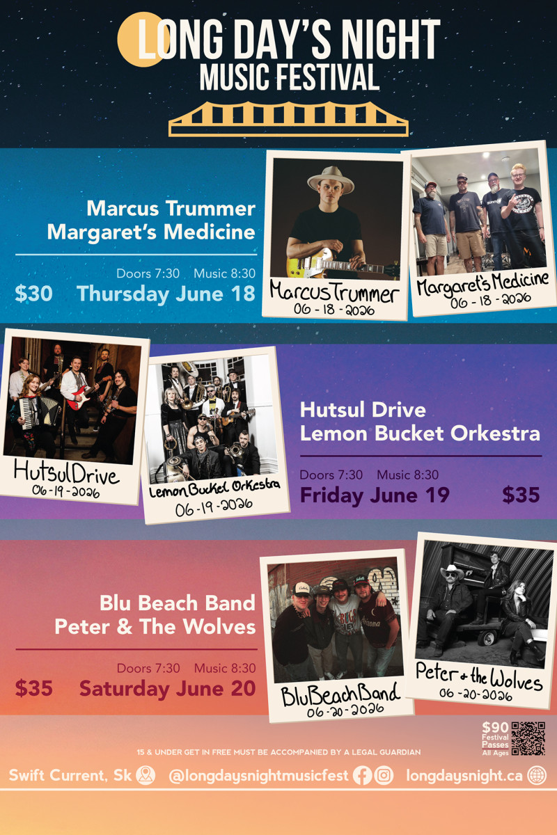 The Long Day's Night Music Festival would like to invite you to come celebrate the longest days of the year with an eclectic collection of great musical performances in Swift Current, SK.