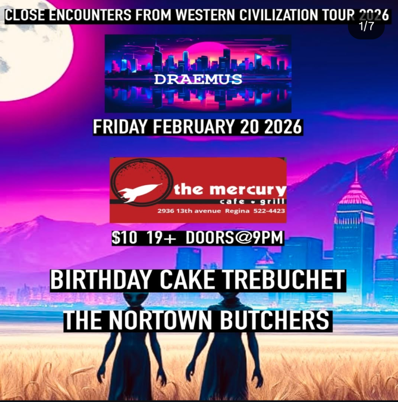 Come on down to the Mercury Cafe on Feb 20th, 2026 for some great music from The Nortown Butchers, Birthday Cake Trebuchet, and to get a close encounter with DRAEMUS!!