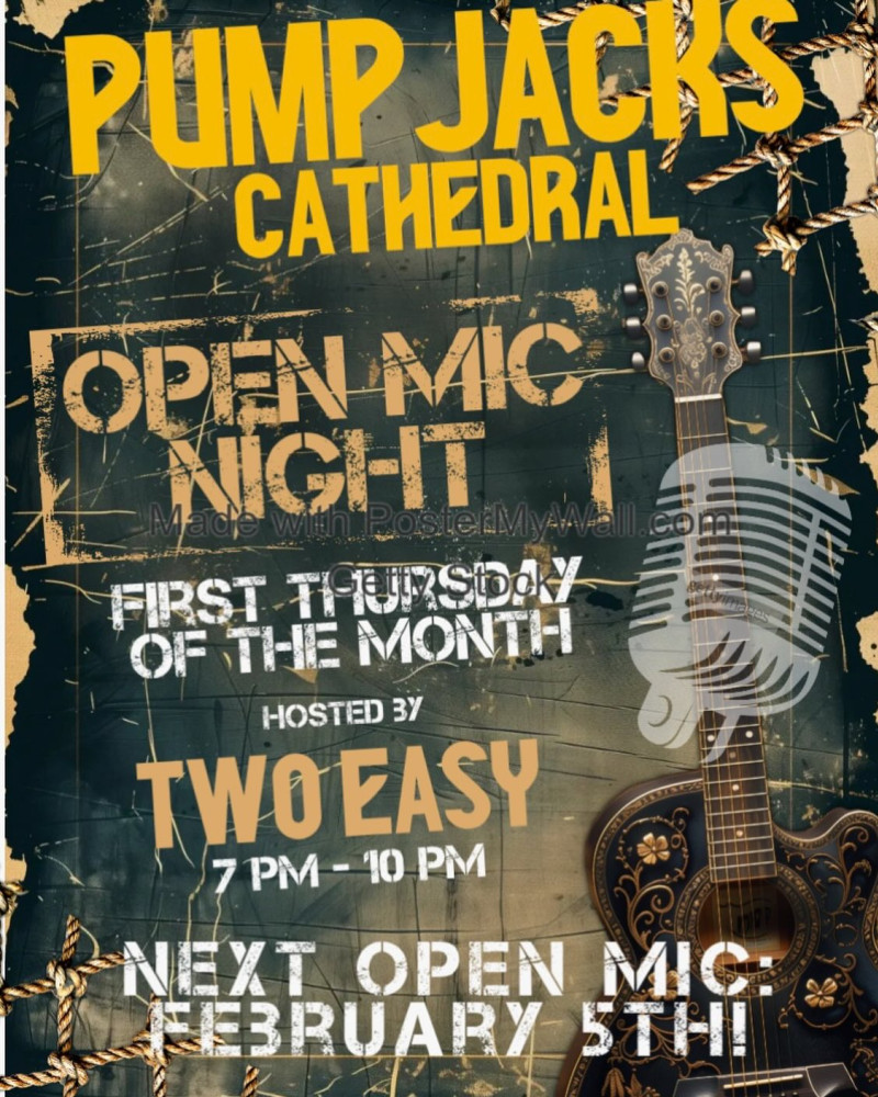 Open Mic Night When February 5, 2026 - Showtime: 7:00pm March 5, 2026 - Showtime: 7:00pm April 2, 2026 - Showtime: 7:00pm Where PumpJacks Cathedral 2062 Albert Street, Regina, SK Links www.instagram.com/p/DTzTss9FwJS/ First Thursday of the Month Hosted by Two Easy Back to Events