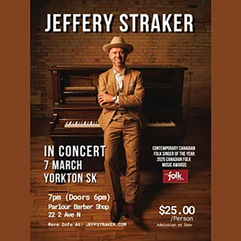 Join singer songwriter pianist Jeffery Straker for this intimate concert at Parlour Barber Shop, Yorkton SK No advance ticketing - admission payable at the door ($25pp) Singer-songwriter pianist Jeffery Straker serves up a rootsy-storytelling brand of song that has been said to transport listeners - out onto a northern Canadian Lake or to the main street of a prairie town. With lyrics underscored by a message of hope and a sense of familiarity, critical comparisons have been drawn to the likes of his influencers - Kris Kristofferson, Jackson Browne and Murray McLauchlan. On the national stage Straker received the 2025 Canadian Folk Music Award for ‘Contemporary Folk Singer of the Year’ & back at home in Saskatchewan he’s twice been named 'Roots-Folk Artist of the Year'. He released his ninth recording “Great Big Sky” in 2024, steeped in prairie-themes. AmericanaUK praised it saying “With emotional and sonic depth this is an album we’d thoroughly recommend”. Unexpected royal recognition came from H.M. King Charles III who was moved by the album after it made its way into Buckingham Palace. Performances have taken Jeffery across Canada (including shows in prairie grain elevators), on multiple UK tours and he was chosen to represent the country in a week-long residency of shows in Osaka Japan at Expo’25. Wherever he performs his audience connections are stand-out and CBC Radio has said: “He has a way of drawing us into his world, making us feel like we’re an old friend he’s ready to catch up with”.