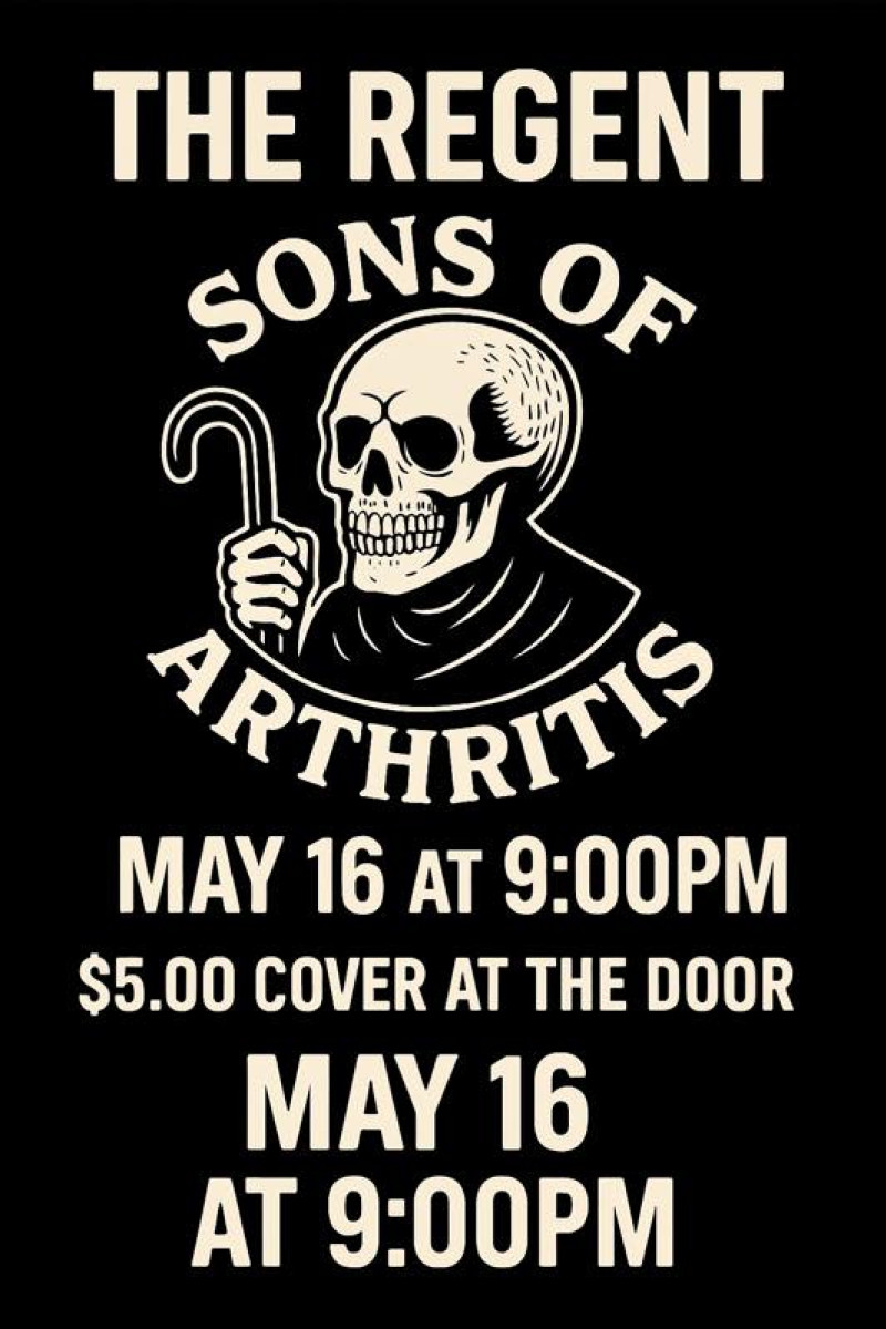 Sons of Arthritis When May 16, 2026 - Showtime: 9:00pm Where The Regent 3823 Sherwood Dr, Regina, SK Links www.facebook.com/photo?fbid=10163754868847931&set=gm.4282357625338114&idorvanity=1460460184194553 Back to Events