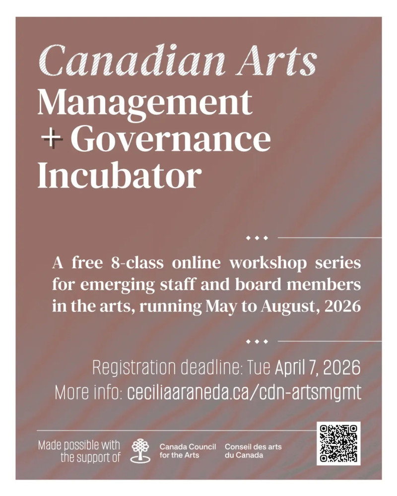 The Canadian Arts Management + Governance Incubator program is a free online workshop series open to emerging and aspiring Canadian arts sector workers and board members connected to groups or organizations with annual budgets under $1 million.