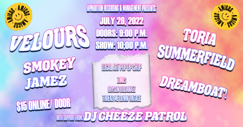 An evening of local live music and market vendors at Amigos Cantina! Hitting the stage we will have Velours, Toria Summerfield, DJ Cheeze Patrol, Smokey Jamez, and Dreamboat! Local vendors on site include J.Inks, BT Bolianatz and Thread Me Down Vintage! Tickets can be purchased online or at the door for $15!