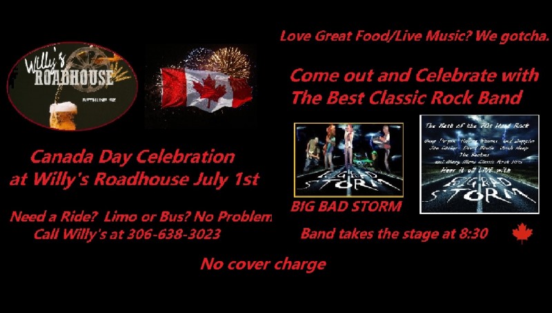 Canada Day celebration at Willy's Roadhouse Bethune Who Big Bad Storm When July 1, 2022 - Showtime: 8:30pm Where Willy's Roadhouse 606 Railway Ave, Bethune, Saskatchewan, Canada Links fb.me/e/1C0B1xB5e Back to Events
