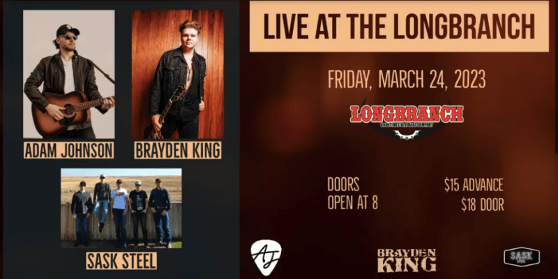 Come Party with us at the Longbranch! Radio recording artist Adam Johnson hits the stage with Brayden King and Sask Steel on March 24th. Combining for hundreds of shows across Western Canada, these artists always bring good times. So come for the music, to dance, or just the atmosphere. This show is primed to be one of the best Country parties of the year. Buy your tickets HERE.
