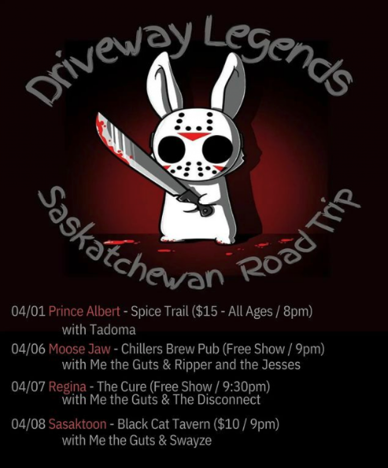 Driveway Legends is going on an SK Road Trip! They'll be in Prince Albert, Moose Jaw, Regina, and Saskatoon! First show is April 1st at the Spice Trail in P.A. $15 all ages show @ 8pm with Tadoma.