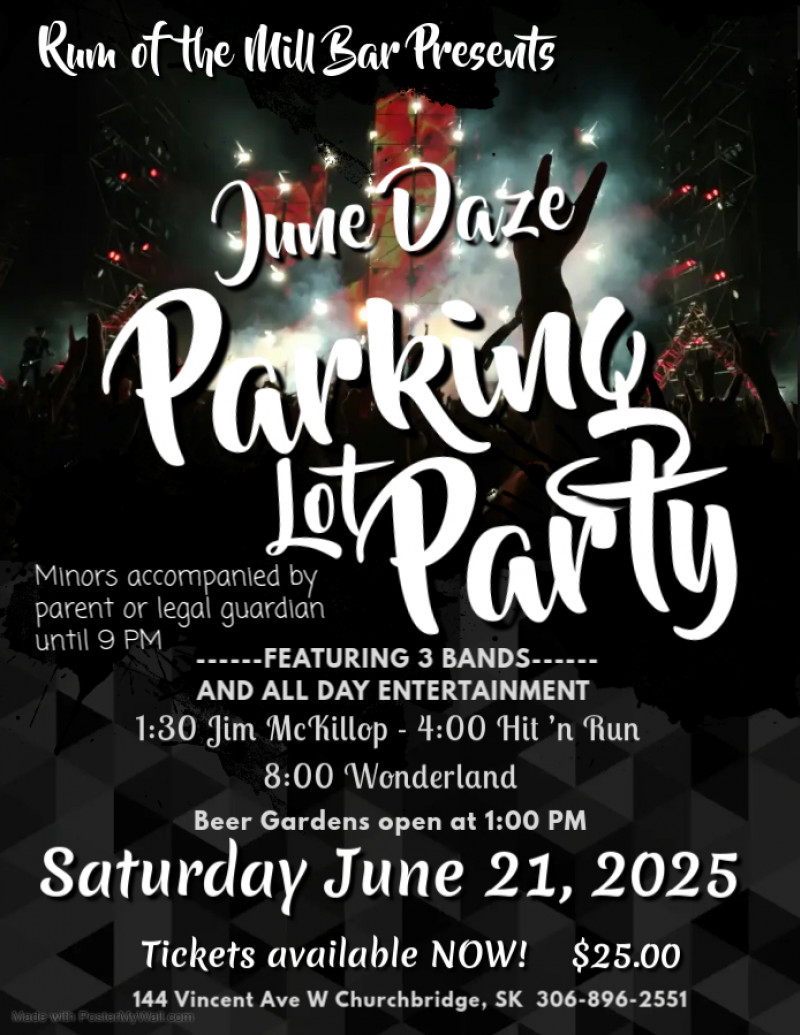 Rum of the Mill Bar in Churchbridge, SK hosting June Daze Parking Lot Party. Featuring live music from three different bands, for all day entertainment. Advance tickets available for $25.00 1:30 PM - Jim McKillop (solo acoustic) 4:00 PM - Hit ‘n Run 8:00 PM - Wonderland Get your advance tickets at Rum of the Mill in Churchbridge. Price increase for walk up admission the day of the event. (306)896-2551 Check us out on Facebook