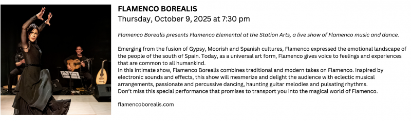 Flamenco Borealis When October 9, 2025 - Showtime: 7:30pm Where Station Arts Centre Box 1078, 701 Railway Ave, Rosthern, SK, CA Links stationarts.com/event/station-arts-concert-series-2025-2026/ Back to Events
