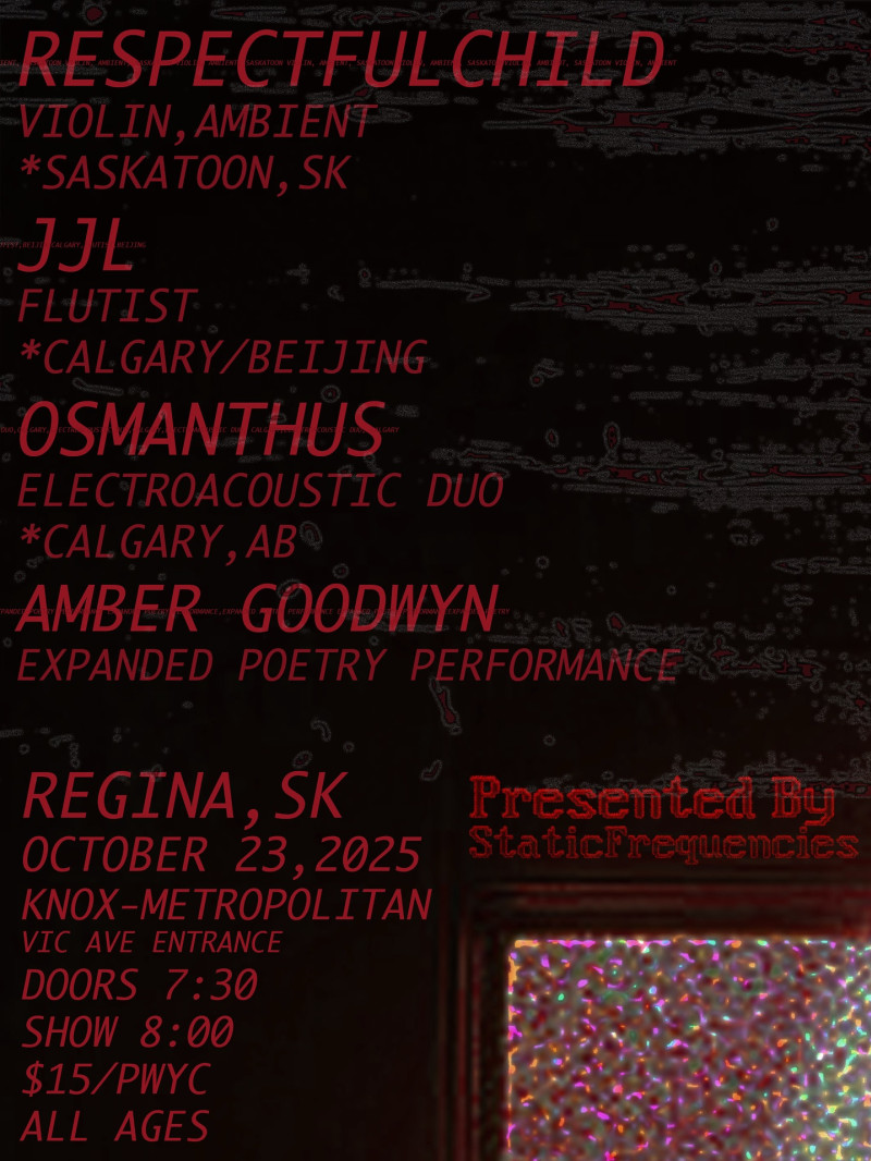 Excited to announce an evening of ambient music featuring artists from across the Prairies—each highlighting a hybrid of acoustic and electronic sound. Amber Goodwyn will be opening the evening with an expanded poetry performance