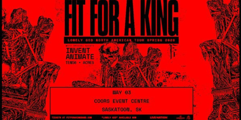 Fit For A King - Lonely God North American Tour When May 3, 2026 - Showtime: 6:00pm Where Coors Event Centre 241 2nd Ave. S, Saskatoon, SK, CA Links www.coorseventcentre.ca/events/www.ticketmaster.ca/event/11006431A3A36AB8 Lineup Fit for a King Invent Animate TEN56 Acres Back to Events