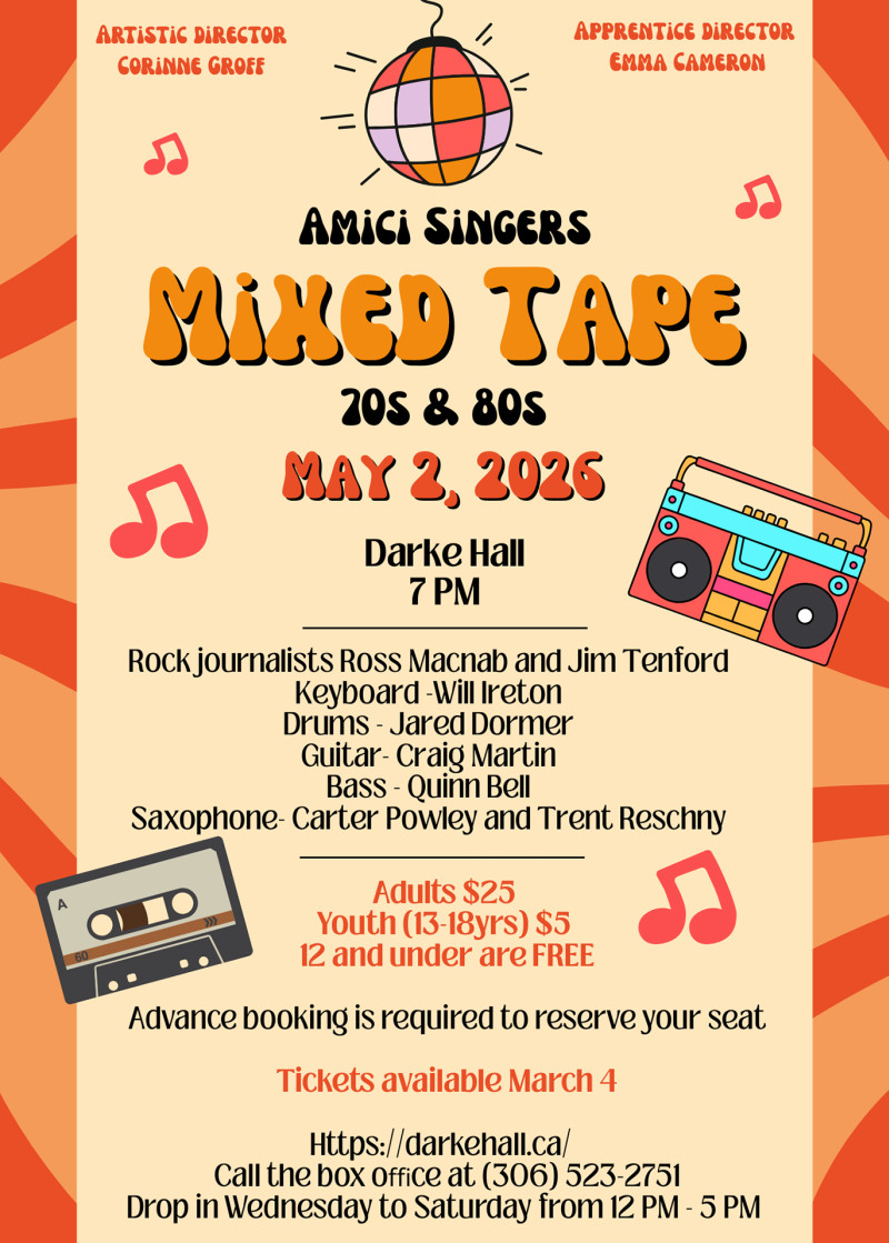 Please join the Amici Singers for a rockin’ time on May 2nd at 7 pm! This community choir and its awesome band present a unique experience of rock and pop music with a choir! It is sure to have you dancing in your seats with hits of the 70’s and 80’s. Led by Artistic Director Corinne Groff and Apprentice Director Emma Cameron and featuring rock journalists Jim Tenford and Ross MacNab.