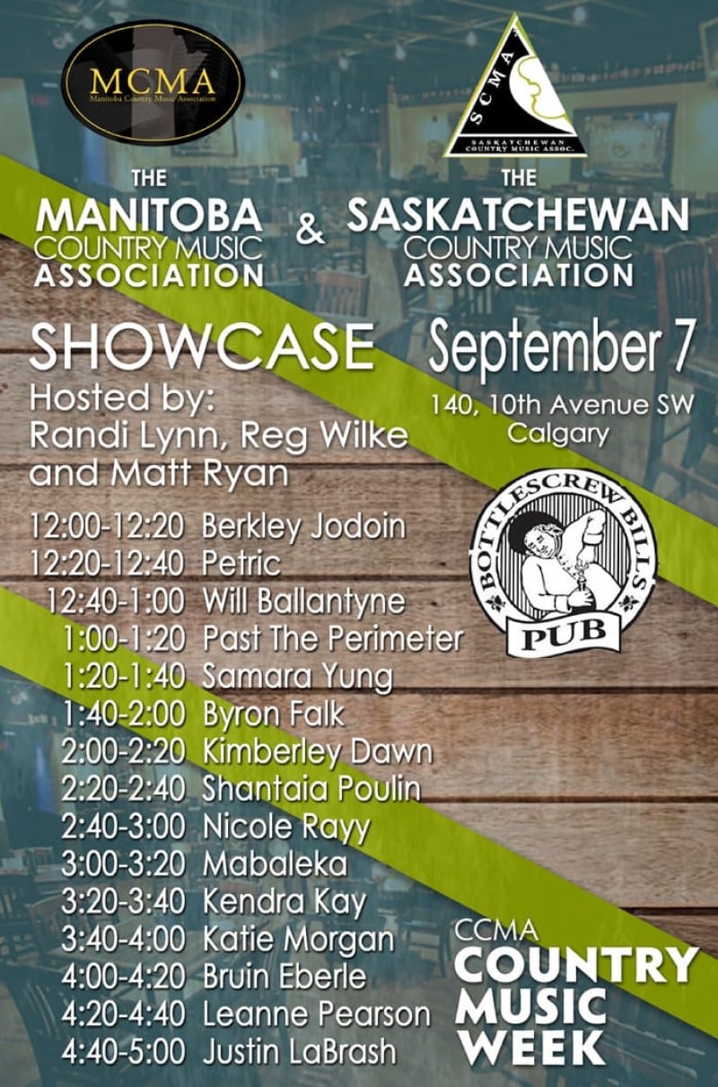 - Berkley Jodoin: 12:00pm Saskatchewan Country Music Association (SCMA) & Manitoba Country Music Association (MCMA) Showcase at Bottlescrew Bills
