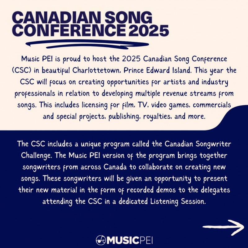 In its eleventh year, the Canadian Songwriter Sessions (formerly known as the Canadian Songwriter Challenge) is a component of Music PEI's Canadian Song Conference. The project matches artists from PEI with artists from partner provinces across Canada, to collaborate and co-write under the mentorship of a prominent Canadian producer. Each pair of artists writes and records two songs in demo form, first meeting for co-writing sessions online and then meeting in person in Charlottetown PEI during the Song Conference, May 28-30/2025. After the songwriting and recording process is completed, each pair of songwriters will have an opportunity to present their songs in Listening Sessions of industry delegates recruited for the CSC, including music supervisors, sync agents, labels, publishers, and other industry professionals.